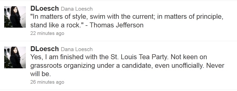 It's funny. Loesch threw the St. Louis Bloggers Guild under the bus when she no longer needed them. She threw her former website designer under the bus when she no longer needed him. She pushed Gina Loudon out of the tea party. And now she's throwing the tea party under the bus cause they're a drag on her minor celebrity status. Amazingly, it's always someone else's fault.